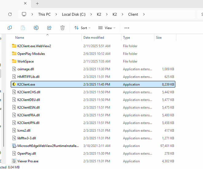 The client lives at "C:\K2\K2\Client\K2Client.exe"