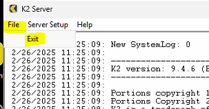 To exit the Server, use the File > Exit menu selection or the Exit button at the top right corner of the window.