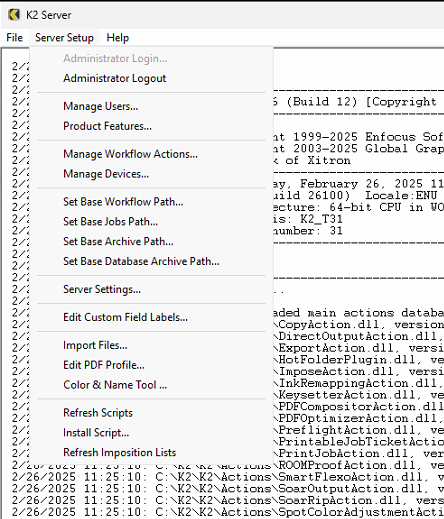 K2 Server is a workflow architecture for prepress and pressroom production. Preflight, Ink Mapping, Color Management, Proofing, RIP, Trapping, Imposition, Job routing, and other modules are all part of the K2 framework.