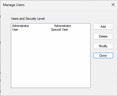 Note that a password is not strictly necessary. If this field is left blank, this User may connect to the system without a password. Specify the User type by clicking one of the Radio Buttons. Choose Administrator or Standard User, or by clicking on the permissions button, create a Special User.