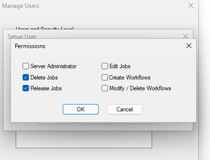 Depending on the type of User created, certain restrictions will apply. For instance, Administrators have all Permissions allowed while Standard Users can only Delete or Release jobs. Special Users are created if you select any other combination of Permissions. After establishing Permissions, click OK until the system returns to the User dialog shown earlier. Confirm the new User(s) is/are shown correctly.