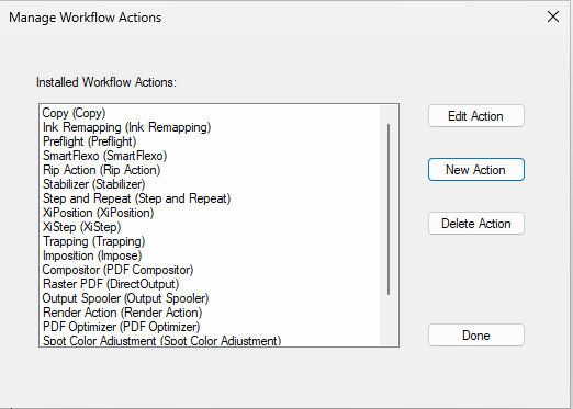 “Actions” describe the individual steps or processes K2 Server uses in the construction of workflows. For example, the RIP Action is a basic action that controls the RIP portion of a K2 Server system. Other actions are optional, and the choices shown in the dialogs will depend on the version of K2 Server as well as the options purchased.