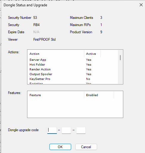 In the lower center of the screen is a list of Actions that are available in the software. To the right of each Action is the word “Yes” if the Action is currently active or “No” if it is not. To enable currently disabled Actions, add a new RIP or Client connections, you must first obtain the appropriate code from your supplier.