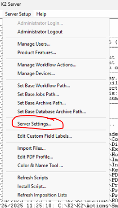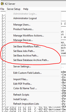 To set System Paths, select the menu items Server Setup > Set Base Workflow Path, Set Base Jobs Path, Set Base Archive Path or Set Base Database Archive Path.