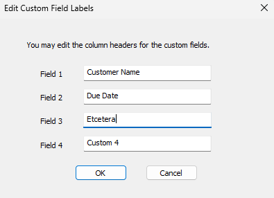To define Custom Field names, select the menu item Server Setup> Edit Custom Field Labels menu. Enter the Names you wish to use in the four boxes and click OK. Name the fields any way you wish. Keep in mind that when a User chooses to display these fields, they will be displayed in order from left to right on the User’s screen,