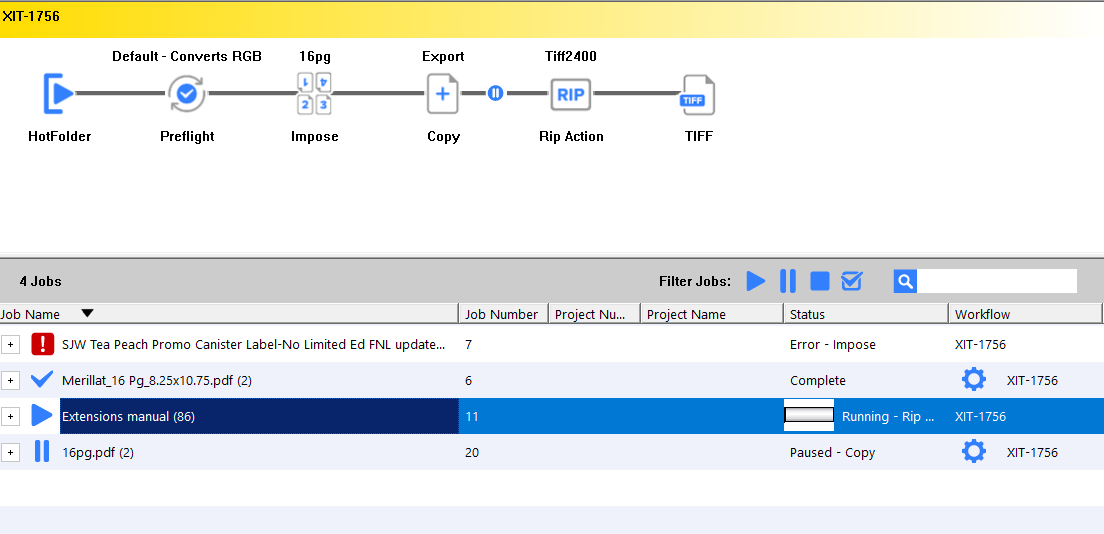 1. Errored job. It shows red and the Status column tells you "Error - Impose". This lets you know that it errored at the 3rd step of the workflow, Impose.