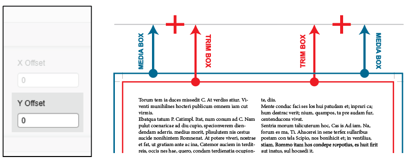 The X offset is anchored to the center of the selected page box. The value that you enter is the distance from the center of the selected page box to the center of the mark on the X axis. It should be noted that this remains true regardless of any rotation of the page that is done within the Advanced Job Editor. If the page is rotated 90 degrees, then the same selected page box will be used, but it will be based on the center of the page boxes facing the selected position of lead or tail edge to maintain the mark placement.