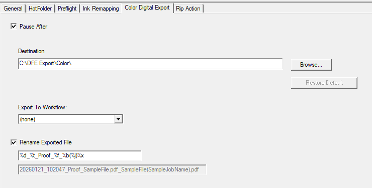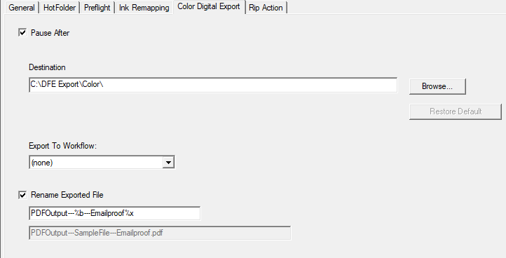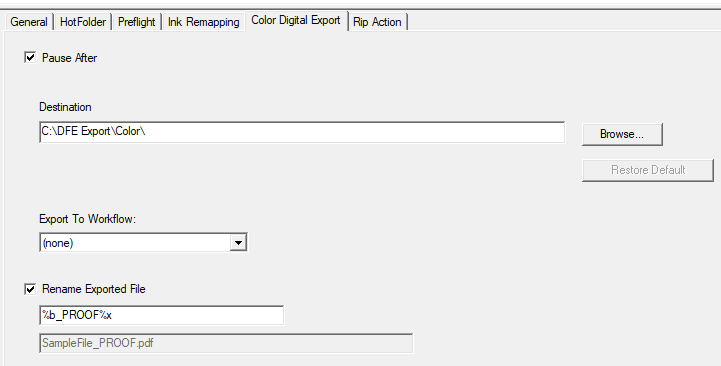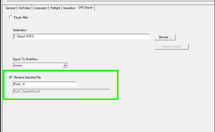 In the example above, we have chosen "Proof_%f". "Proof_" will appear exactly as typed and following that you get the entire filename with the extension. This is a simple option for outputting files for proof. The resulting file name for an input file called "SampleFile.pdf" will be "Proof_SampleFile.pdf".