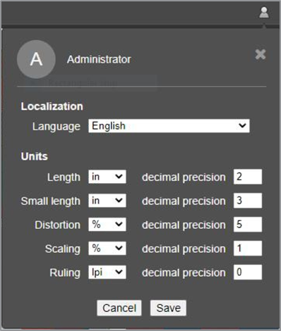 Click the Icon in the upper right corner of the viewer to set language and units of measurement. Click Save to save the settings to the user profile.