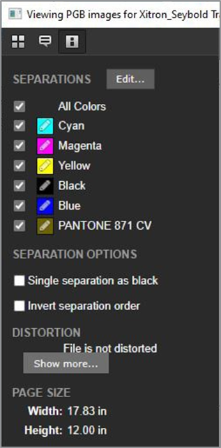 Lists all the color separations found in the job, including spot colors if they are present. By default, all separations are clicked “On” when the job is first being viewed. Un-checking the boxes next to each color will turn those colors off in the main viewing window. More information about the separations dialog can be found later in this document.