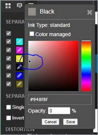 It’s also possible to change the color makeup of each of the separations, including any spot colors found in the job. To do so, click the Edit button located at the top of the separations window. A pencil icon will appear in each of the separation color blocks. Clicking the icon for Cyan, Magenta, Yellow, or Black will post a window noting that those colors are “managed.” To continue with changes, click the Color Managed box and a color picker will appear. Click to get an approximation of the color desired, and click Save.