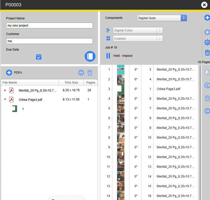 Here we see a 16 page imposition where page 3 is NO LONGER coming from the Merillat job. It is now coming from a single page PDF. You can see in the right column where page 3 is coming from that single page PDF called Orbea. The compositor assembles the chosen pages, in the chosen order, and leaves the replaced pages behind when submitting the imposition.