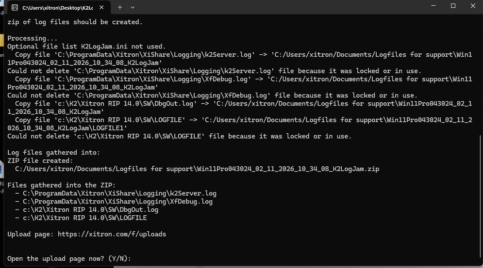 It will then offer to take you to our upload site so you can drop the files off. Be sure and let us know you have done this by opening a ticket. (Open tickets with Xitron Support here.)