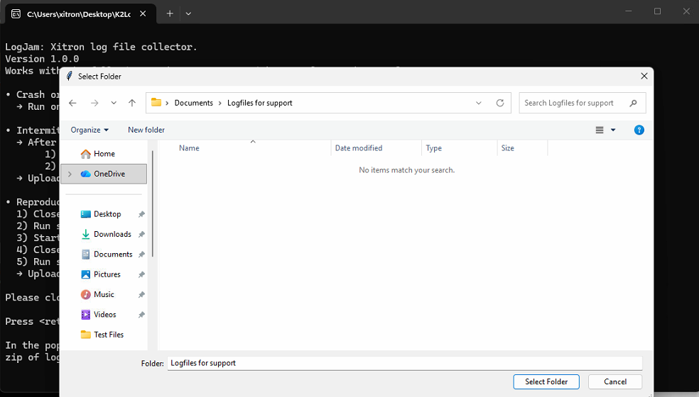 Pick a location to save the zipped up logfiles to.