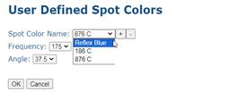 The user defined Spot Color window will display. Click the “ + “ button to enter a new spot color name. The screen frequency and angle are then set from selections in the dropdown list. Repeat the process for additional spot color definitions. To view the list of spot colors defined, click the dropdown menu next to Spot Color Name. Defined spot colors can be removed by clicking the “ - “ button. Click OK to save the spot colors to the screening template.