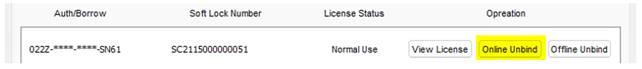 Click online Unbind button. The license will then unbind to the PC.